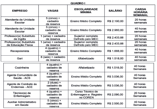 A prefeitura de Quinta do Sol abriu processe seletivo simplificado com 41 vagas mais cadastro de reserva para 10 cargos. As inscrições poderão ser feitas entre os dias 23 e 27 deste mês (semana que vem), diretamente na prefeitura. Os salários variam de R$ 1,5 mil a R$ 3 mil (veja quadro acima). A prova objetiva será aplicada no dia 6 de julho.