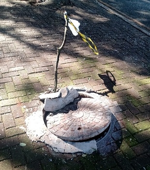 Sinalização improvisada alerta para perigo nas praças centrais de Campo Mourão.