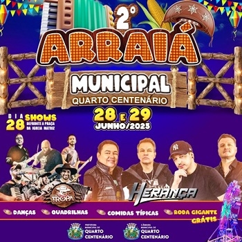 Quarto Centenário – Acontece neste sábado e domingo, na praça da matriz, o Arraiá Municipal. Entre as atrações, shows com o grupo Troca e a Banda Herança, além de roda-gigante gratuita.