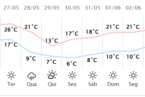 Preparem as blusas e as cobertas. O Simepar está prevendo 18 milímetros de chuva em Campo Mourão na quarta-feira, e a partir daí a temperatura cai. A máxima não passa de 13 graus na quinta, a mínima chega a 6 graus na sexta. Na sequência “esquenta”, mas a máxima até a próxima segunda-feira fica na casa dos 21 graus.