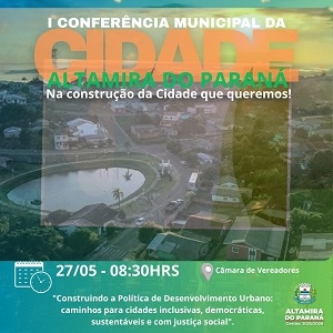 Altamira do Paraná – Acontece no próximo dia 27 (8h30), na Câmara, a 1ª Conferência Municipal da Cidade. Tema? “Construindo a política de desenvolvimento urbano: caminhos para cidades inclusivas, democráticas, sustentáveis e com justiça social.