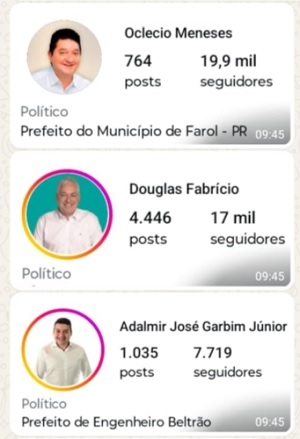 O prefeito de Farol, Oclecio Meneses, é quem tem mais seguidores – 19,9 mil, seis vezes mais que a população de seu município.