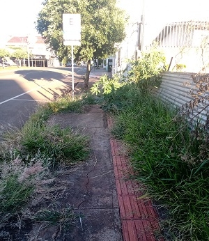 Calçada tomada pelo mato na rua Santa Cruz, centro de Campo Mourão.