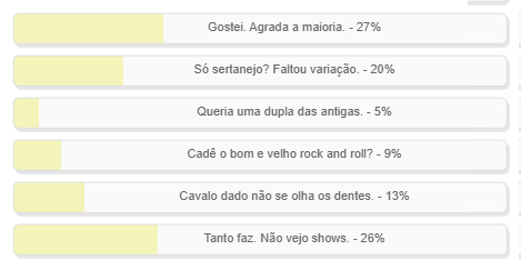 “O que achou dos shows anunciados para a Festa do Carneiro no Buraco?” Enquete encerrada neste domingo deu vitória à alternativa “Gostei. Agrada a maioria”, com 27% dos votos. Mas foi apertado. “Tanto faz. Não vejo shows” teve 26%. “Só sertanejo? Faltou variação” fechou o pódio com 20%. O resultado completo está no quadro acima.