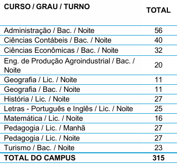 No câmpus de Campo Mourão há 315 vagas em 11 cursos (veja acima).