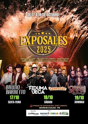 Começa nesta sexta-feira, em Moreira Sales, a Expo-Sales 2025. A abertura será com a dupla Bruno & Barreto. No sábado tem Fiduma & Jeca mais a banda Garrafão. A programação termina, domingo, com a banda Brasil 2000. A festa acontece no Parque de Exposições e tem ainda rodeio, tudo com entrada gratuita.