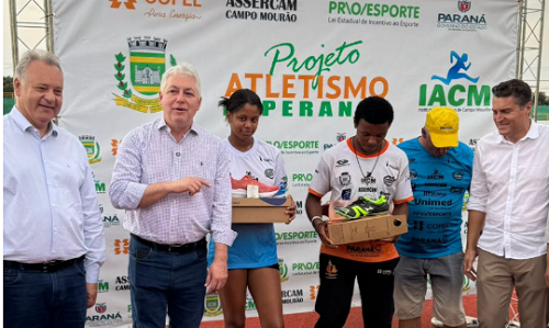 O projeto “Atletismo Esperança” recebeu, nesta sexta-feira, novos materiais esportivos. Os equipamentos foram repassados por meio da Lei de Incentivo ao Esporte do Estado do Paraná (Proesporte). O projeto atende cerca de 100 alunos e atletas, com escolinhas de iniciação, treinos de rendimento e aperfeiçoamento técnico. A entrega contou com a presença dos prefeitos Douglas Fabrício (Campo Mourão) e Fábio D’Alécio (Ubiratã).