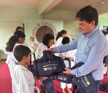Farol – Os alunos do projeto de Karatê de Farol, mantido pela prefeitura, foram avaliados por exames de graduação de faixa e receberam mochilas esportivas. O prefeito Oclecio Meneses participou da entrega.