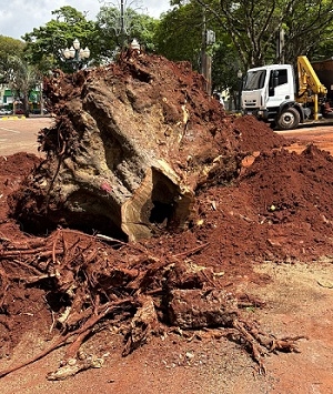 Árvore extraída na praça São José. Estava oca por dentro. Um perigo para os pedestres e veículos estacionados no local.