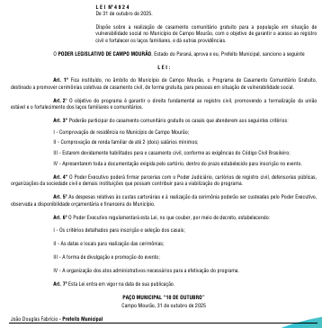 O prefeito de Campo Mourão, Douglas Fabrício, sancionou a lei que cria o Programa de Casamento Comunitário Gratuito.