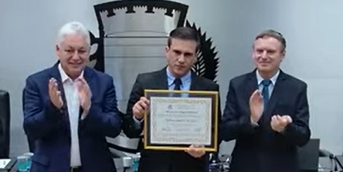A Câmara de Campo Mourão realizou sessão solene nesta quinta-feira à noite. Foi para a entrega de moção ao diretor da penitenciária local, Fabiano Gustavo de Castro. Ele recebeu a homenagem das mãos do prefeito Douglas Fabrício e do vereador-autor, Escrivão Parma. Oito vereadores estiveram presentes.