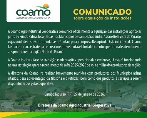 “Esta iniciativa da Coamo faz parte de sua estratégia de crescimento sustentável, fortalecimento operacional e atendimento aos produtores da região Norte do Paraná”, destaca o texto.
