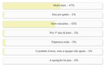 “Como foi o 1º ano de mandato do prefeito de sua cidade?” Enquete encerrada neste domingo deu vitória à alternativa “Muito bom”, com 47% dos votos. “Bem ruinzinho” ficou em segundo, com 43%. Ou seja: enquete bem polarizada (a terceira colocada teve apenas 3%). O resultado completo está no quadro acima.