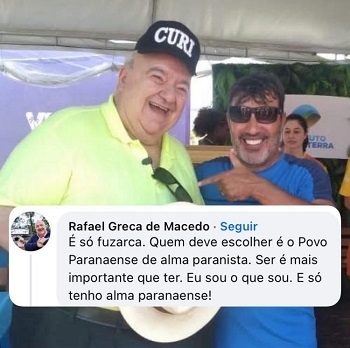 Deu o que falar a foto que Antônio Carlos Rodrigues, de Campo Mourão, fez no último fim de semana, no litoral, junto com o secretário de Estado Rafael Greca. Pudera. Greca, que é pré-candidato a governador, aparece usando boné de outro pré-governadorável, Alexandre Curi. Tudo brincadeira do mourãoense, mas até o ex-prefeito de Curitiba foi às redes sociais para explicar que era “só fuzarca”.