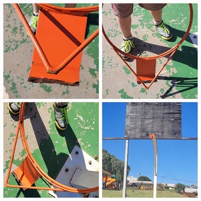 “Ademais nenhuma cesta de basquete não existe mais. A ação do tempo destruiu toda a tabela/madeiramento, a ferrugem danificou os ferros utilizados nas traves e gols/cestas. O que se percebe-se foi empregado um péssimo material na reforma”.