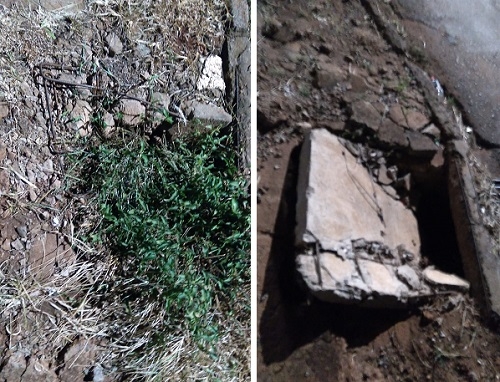 Esses perigoso aqui são na via João da Silva Résio, esquina com a rua das Palmeiras. A foto à esquerda é um bueiro aberto e coberto de vegetação.