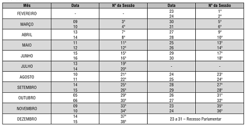 A Câmara de Campo Mourão fará 38 sessões ordinárias ao longo deste ano. As primeiras serão dias 23 e 24 de fevereiro e, as últimas, em 14 e 15 de dezembro. O horário foi mantido: 9h. O calendário das sessões foi publicado nesta quinta-feira. A Câmara realiza ainda sessões extraordinárias, especiais e solenes, além de audiências públicas.