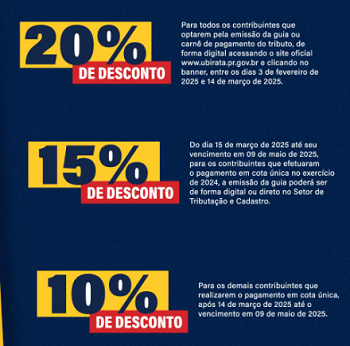 De 15 de março a 9 de maio cai para 15% para quem pagou à vista em 2024 e para 10% para os demais.
