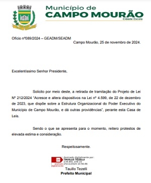 O prefeito Tauillo Tezelli enviou ofício à Câmara pedindo a retirada da tramitação da matéria.