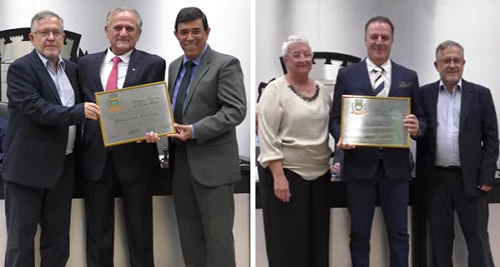 Os desembargadores do TJPR Abraham Abraham Lincoln Merheb Calixto e Evandro Portugal agora são cidadãos honorários de Campo Mourão. As homenagens foram entregues em sessão solene da Câmara realizada neste sexta-feira. Os dois são responsáveis pelo programa Moradia Legal, que vem regularizando imóveis na cidade. A entrega foi feita pelo prefeito Tauillo Tezelli e pelos vereadores-autores Sidnei Jardim e Elvira Schen.