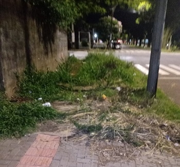 Calçada tomada pelo mato na av. Capitão Índio Bandeira, centro de Campo Mourão.