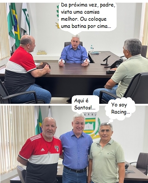 Os cliques são desta sexta-feira, quando o prefeito de Campo Mourão, Douglas Fabrício, ecebeu a visita do padre Gaspar Gonçalves e do pesquisador Ruben Moyano. Em pauta, o Caminho Iniciático de Santiago de Compostela, entre Campo Mourão e Fênix. E não é que o padre apareceu usando uma camisa do São Paulo? Em tempo: Douglas é santista e, Moyano, que é argentino, torce para o Racing...
