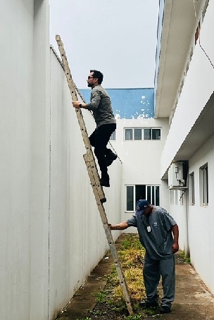 O clic é desta segunda-feira, quando o interventor da Santa Casa de Campo Mourão, Sérgio Henrique dos Santos, subiu a escada para conferir o telhado do hospital. Isso depois que, na chuva de domingo, um pedaço do gesso do teto de um dos corredores desabou.