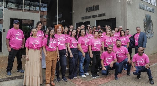 Vereadores e funcionários da Câmara de Campo Mourão vestiram nesta terça-feira uma camiseta rosa com o slogan “Cuide-se. Previna-se”. A iniciativa da vereadora e Procuradora da Mulher, Naiany Hruschka Salvadori, foi para conscientizar sobre a importância da prevenção e do diagnóstico precoce do câncer de mama e do coleto de útero.