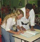 Cerca de 150 crianças de Farol vão ter aulas gratuitas de caratê. Isso através de convênio firmado entre a prefeitura e uma escola da modalidade (foto). Segundo a prefeita Dina Cardoso, serão repassados R$ 1,5 mil por mês à escola. No mês passado, Farol foi campeão da 6ª Copa Tiradentes, em Apucarana. Ih, mas não precisou deixar os adversários banguelas, né?...