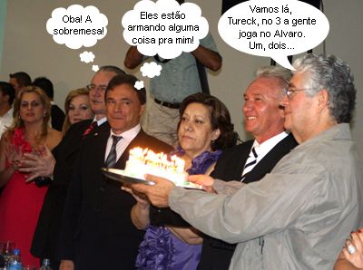 Olha aí mais um clic da solenidade que comemorou os 40 anos da Comcam, anteontem à noite, no Clube 10. O governador Roberto Requião e o prefeito Nelson Tureck receberam o bolo com as 40 velinhas acesas. Tudo atentamente observado pelo senador Álvaro Dias e sob os aplausos do vice-governador Orlando Pessuti. A vice-prefeita Regina Dubay, a mulher do vice-governador, Regina Pessuti, e a primeira-dama Rita Tureck também estão no clic. E se a vida começa aos 40...