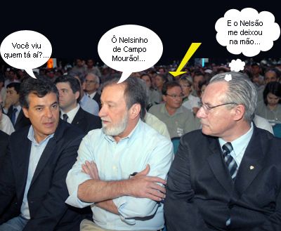 O clic é da agência de notícias do governo do Estado e foi feito ontem, em Pinhais (região de Curitiba), durante encontro promovido pela Faep. O trio de governadoráveis Beto Richa (prefeito de Curitiba), Osmar Dias (senador) e Orlando Pessuti (vice-governador) sentou lado a lado na primeira fila. E olha só quem ficou aparecendo ali atrás, entre Osmar e Pessuti: o presidente do Sindicato Rural de Campo Mourão, Nelson Teodoro de Oliveira. Aliás, quem são esses três da frente mesmo?...