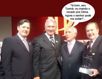 ENQUANTO ISSO, NA PREMIAÇÃO EM SÃO PAULO... O clic vem de São Paulo, onde o presidente da Coamo, Aroldo Gallassini, foi buscar o prêmio de melhor empresa do Agronegócio Brasileiro, oferecido pela revista “Isto É Dinheiro”. Foi a terceira vez que a Coamo faturou esse. O vice-presidente da República, Michel Temer, esteve por lá. Olha ele aí, junto com Gallassini, o prefeito Nelson Tureck e o ex-deputado Rodrigo Rocha Loures, que agora é assessor de Temer.