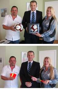 A prefeita Dina Cardoso (Farol) esteve com o secretário de Estado e árbitro da Fifa, Evandro Rogério Ramon (Esportes). Foi junto com o vereador Agnaldinho do Cachorro-Quente pedir a liberação de material esportivo. E não saíram de mãos abanando, não. Roman presenteou a dupla de Farol com bolas oficiais da Copa Sul-Americana e com cartões oficiais (vermelho e amarelo) da Fifa. Olha aí, esse é o secretário que dá bola...