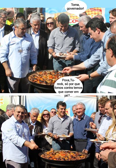 ENQUANTO ISSO, NO CARNEIRO NO BURACO... Olha aí mais clics de domingo, durante a Festa Nacional do Carneiro no Buraco. Desta vez, eles mostram o momento da retirada do tacho número um, com a presença do governador Beto Richa e do prefeito Nelson Tureck. Repare que este ano tinha até prato para o pessoal já saborear os primeiros pedacinhos. Olha o deputado Rubens Bueno já comendo ali atrás. E quem está se servindo na primeira foto é o novo senador Sérgio de Souza. Viu só, não precisa mais ficar dando beliscadinhas com as mãos, como nos tempos do governador Orlando Pessuti...