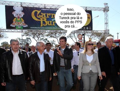 O clic é de ontem, na Festa Nacional do Carneiro no Buraco, em Campo Mourão. O governador Beto Richa esteve presente, o que resultou numa “mistureira” danada de políticos adversários. Como dá pra ver na foto, de um lado os deputados Douglas Fabrício e Rubens Bueno, do outro a deputada Marla Tureck e o prefeito Nelson Tureck. Todos bem comportadinhos, tá! Nada de socos desta vez...