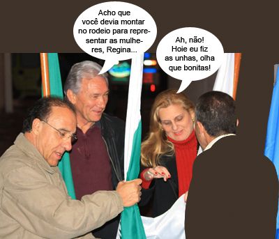 ENQUANTO ISSO, NA ABERTURA DO RODEIO... O clic é do jornalista Fernando Lorenzo – www.tabendo.com – e mostra a concentração na hora da abertura do rodeio da 21ª Festa Nacional do Carneiro no Buraco. Estão na foto o presidente da festa, o secretário Alcione Jacob (Desenvolvimento Econômico), o prefeito Nelson Tureck e a vice-prefeita Regina Dubay. Cada um entrou na arena levando uma bandeira. Aliás, sobrou até para a rainha da festa, Mariana Sambatti, a bandeira do Carneiro no Buraco. É, não basta ser rainha, tem que participar...