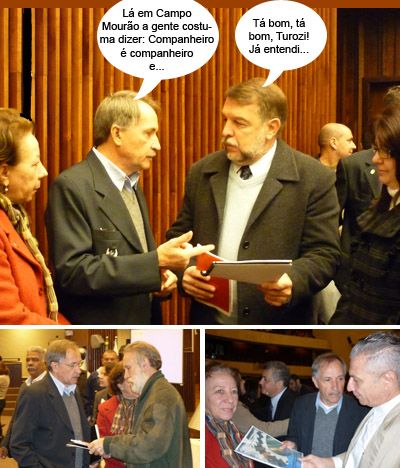 ENQUANTO ISSO, NA AUDIÊNCIA PÚBLICA DO PNE... Os clics vêm de Curitiba, onde aconteceu audiência pública do Plano Nacional de Educação 2011/2020. O mourãoense José Turozi, que preside a Federação das Apaes do Paraná, esteve por lá e apresentou 38 emendas na área de educação especial. Manteve contatos com os deputados Angelo Vanhoni (relator do PNE), Dr Rosinha e Alex Canziani, além do vice-governador e secretário de Estado Flávio Arns (Educação), que é velho companheiro de movimento apaeano. E companheiro é companheiro, né?...