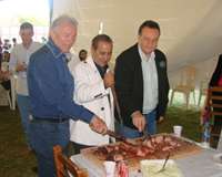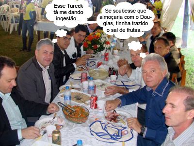 ENQUANTO ISSO, NA FESTA DO LEITÃO MATURADO... O clic é da 9ª Festa do Leitão Maturado, que foi realizada ontem em Goioerê. Sete mil pessoas almoçaram por lá e em meio a uma estrutura com 6,4 mil cadeiras, quis o destino que o prefeito Nelson Tureck e o deputado Douglas Fabrício almoçassem assim, frente a frente. A mesa das autoridades até que era grande, mas quando o deputado chegou, só tinha lugar na frente do prefeito. Deuzolivre!...