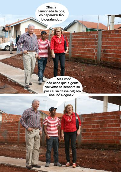 ENQUANTO ISSO, NA VISITA AO CALÇAMENTO... O prefeito Nelson Tureck e a vice Regina Dubay estiveram ontem no conjunto Maria Barleta. Foram vistoriar as obras de calçamento na as vias do conjunto São Francisco de Assis. O presidente da Associação de Moradores, Luiz de Jesus, acompanhou tudo. O investimento é de R$ 113 mil, dinheiro que veio do Ministério das Cidades com uma ajudinha do deputado Fernando Giacobo. E nada a ver com o Dnit, né?...
