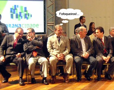 ENQUANTO ISSO, NO EVENTO EM CURITIBA... O clic é do evento em Curitiba que liberou R$ 3,1 milhões para recape de ruas em 12 cidades da região. O presidente da Acampar e da UVB, o vereador Bento Batista (Juranda), esteve por lá. Como se vê na foto, ele se comportou direitinho, enquanto ao seu lado o pessoal colocava a fofoca em dia, incluindo aí o presidente do Águas Paraná, o mourãoense Márcio Nunes (à dir.). Que feio, né?...