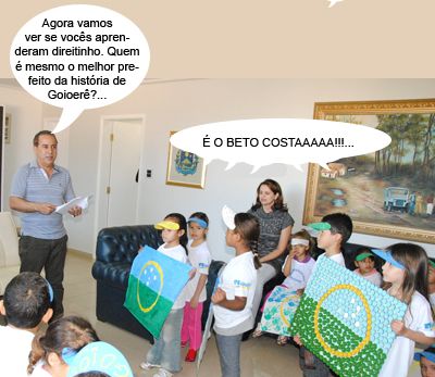ENQUANTO ISSO, NO ANIVERSÁRIO DE GOIOERÊ... O clic é de ontem, em Goioerê, onde crianças atendidas pelas creches do jardim Universitário e de Jaracatiá foram visitar a prefeitura e realizaram atividades em comemoração ao aniversário do município. Goioerê completou 56 anos ontem. Um grupo foi recepcionado pelo prefeito Beto Costa e fez apresentação mostrando que conhece a história do município, além de cantar o hino de Goioerê.