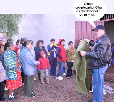 ENQUANTO ISSO, NA ENTREGA DOS COBERTORES... O que é isso? O prefeito Ricardo Radomski (Mamborê) aproveitando o frio para faturar um extrazinho? Calma, que as aparência enganam. Ele apenas foi participar da entrega de cobertores, agasalhos e calçados para famílias carentes do município. Um total de mil cobertores foram adquiridos com recursos do próprio da prefeitura. As roupas, agasalhos e calçados foram arrecadados em campanha do Provopar. E xô, frio!...