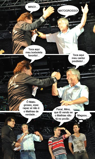 Os clics são do show com a dupla Matogrosso & Mathias, que aconteceu segunda-feira, como parte dos festejos pelos 57 anos de Araruna. O prefeito Mino Bonato e o vice-prefeito Renato Toaldo subiram ao palco e cantaram o “Parabéns pra você” para a cidade junto com a dupla. Para os desavisados, que fique claro: o Mathias original deixou a dupla há uns cinco anos e foi substituído por um sobrinho de Matogrosso. Viu só, nepotismo artístico...