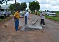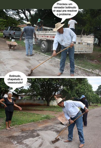 Os clics são do site Tá Sabendo – www.tasabendo.com – e foram feitos ontem à tarde no jardim Tropical. Esse que você vê aí tapando buraco é ele mesmo, o vereador Isidoro Moraes. Ele encheu um caminhão com pó de mármore e cal e com a ajuda de moradores do bairro tapou alguns buracos que andavam irritando o pessoal que mora por lá. Viu só, quem disse que vereador não é “executivo”...