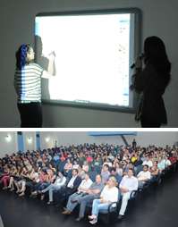 O Centro Cultural de Mamborê ficou praticamente lotado, ontem, para que representantes do grupo Positivo fizessem a apresentação da lousa digital. Estavam por lá prefeito, vice, presidente da Câmara, vereadores, secretários municipais e até padre e pastor. Tudo pra ver a nova lousa prevista no Projeto Educação Digital. Ela irá substituir o velho quadro-negro. Ops, melhor falar “quadro afro-descendente”...
