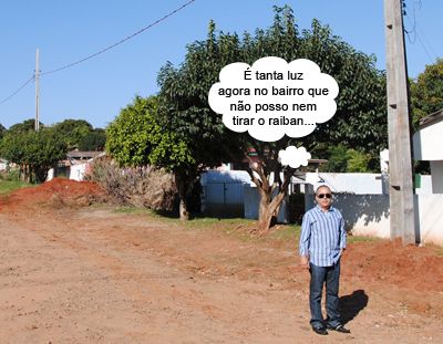 ENQUANTO ISSO, NA VISITA AOS BAIRROS... O clic vem de Goioerê, onde o prefeito Beto Costa foi dar uma conferida na ampliação do sistema de iluminação pública. Segundo ele, há pontos da cidade onde os moradores esperavam a melhoria há 20 anos. A atual etapa prevê mais de 80 postes no distrito de Jaracatiá, nos jardins Primavera, Galiléia, Santa Casa e Curitiba, nos conjuntos Cidade Alta e Águas Claras e nas vilas Guairá e Candeias. E haja raiban pra agüentar a claridade...