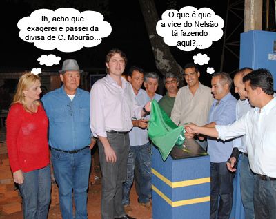 O clic é de segunda-feira à noite, em Goioerê, durante a inauguração do sistema de abastecimento de água das comunidades rurais Bairro dos Gonçalves e Santa Luiza. Estão na foto os prefeitos Beto Costa (Goioerê), Luiz Volpato (Moreira Sales) e Osvaldo Changai (Quarto Centenário), além do deputado federal Zeca Dirceu e da vice-prefeita Regina Dubay (Campo Mourão), entre outras lideranças locais. Mas peraí! O que a Regina Dubay tá fazendo em Goioerê? Foi conversar com Zeca Dirceu. Hummmm...