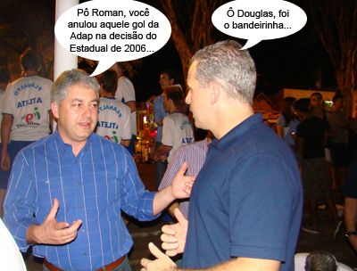 O clic é de sexta-feira, nos bastidores da solenidade de abertura dos 25º Jogos da Juventude do Paraná. O deputado Douglas Fabrício aproveitou para colocar a conversa em dia com o secretário de Estado Evandro Rogério Roman (Esportes). É ele mesmo, o juiz que anulou um gol legítimo (na versão mourãoense) da Adap no primeiro jogo da decisão do Paranaense de 2006, contra o Paraná (aquele, que a gente perdeu de 3 a 0, em Maringá). Mas ai se aquele gol do Marcelo Peabiru tivesse sido validado...