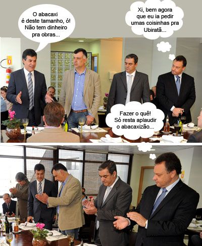 O clic vem de Curitiba, onde o presidente da Comcam, Fábio D’Alécio (Ubiratã), esteve com o governador Beto Richa. Foi tratar sobre investimentos em todos os municípios da região. Os presidentes das outras 21 microrregiões do Estado e a diretoria da Associação dos Municípios do Paraná também participaram do encontro. Richa disse que em breve o Paraná vai se transformar num canteiro de obras. Oxalá!...