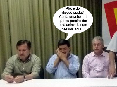 O clic é da semana passada, durante o congresso municipal do PPS. O vereador Sidnei Jardim atendeu o celular ladeado pelo ex-prefeito Tauillo Tezelli e pelo deputado Douglas Fabricio, que não demonstram muita animação, não. Pelo menos na foto a aparência é de desânimo. Douglas foi eleito presidente do diretório municipal, com Tauillo de vice. Ah, deve ser pelo “salário” dessas funções...